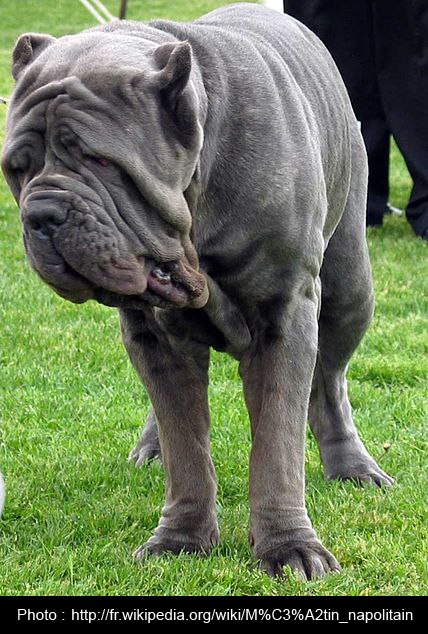 Matin de NaplesLe mâtin de Naples est un chien assez particulier qui était jadis utilisé comme chien de combat. Il peut atteindre les 70 kg. Il n’en demeure pas moins que ce molosse est calme et attachant. Il a besoin d’exercice quotidien, mais n’est pas très actif. Malgré sa stature imposante, il convient très bien à la vie à l’intérieur car il craint le froid. Si vous êtes maniaque de la propreté, tenez-vous près de lui après ses repas car il bave beaucoup!