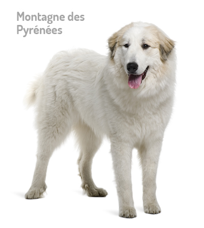 Montagne des PyrénéesCe gros « nounours » peut peser jusqu’à 68 kg et possède un grand instinct protecteur envers les élus de son cœur, mais il n’attaque pas. Il n’apprécie guère la vie à l’intérieur et grâce à sa fourrure épaisse, il tolère bien les temps froids. Son niveau d’énergie étant élevé, il a besoin de grands espaces pour bouger.