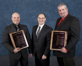 M. Éric Nadeau, Claude Bouchard, directeur bureau de Québec de la Commission de la construction du Québec et Eddy Carbonneau, gagnants dans la catégorie « Bourse entrepreneurship», dans l’est du Québec, dans le cadre du Gala Habitation 2011